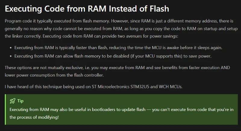 Added info on executing code from RAM instead of flash to the Low Power Design page.