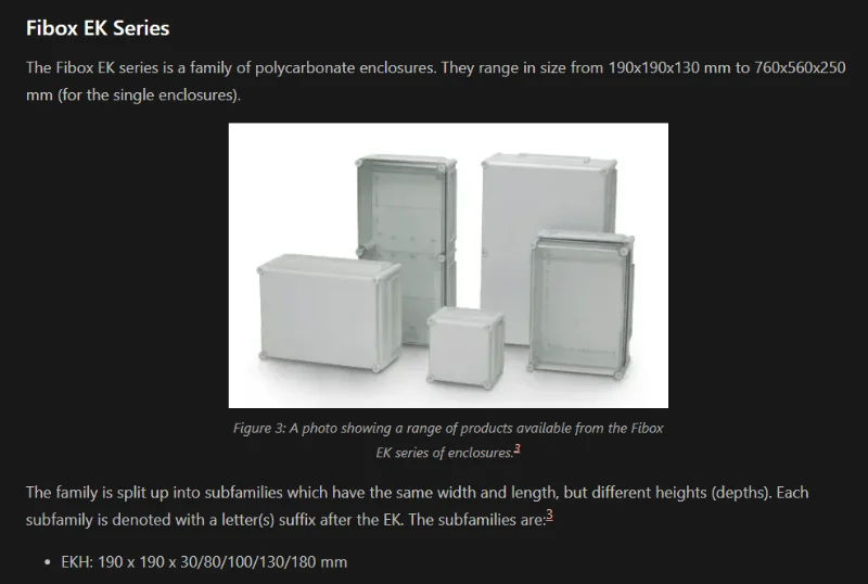 Added info on the Fibox EK series enclosures to the Enclosures page.