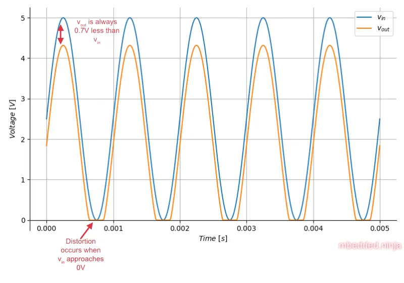 This is a placeholder for the reference: fig-basic-common-collector-amplifier-plot-annotated shows a graph of vs. for the circuit in This is a placeholder for the reference: fig-common-collector-bjt-amplifier-basic-schematic, with .