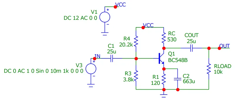 The finished schematic, along with voltage sources ready for simulation is shown in This is a placeholder for the reference: fig-common-emitter-amplifier-design-process-schematic.