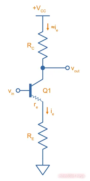 Thus, for our signal frequencies at which the capacitor shorts out external resistor , the emitter resistance is just and the gain becomes: