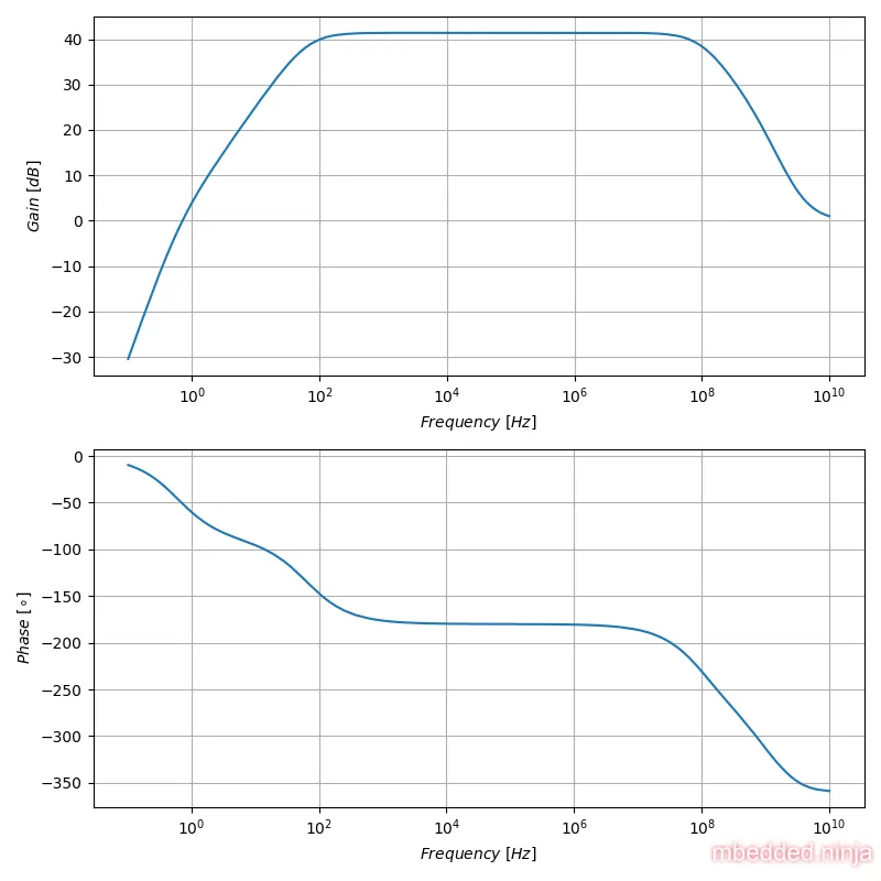 The simulated frequency response shown in This is a placeholder for the reference: fig-common-emitter-amplifier-simulation-freq-response-plot is close to what we expect. The simulated gain of around is close enough to our calculated gain of considering all the approximations we made! The phase shift is for most of our signal bandwidth.