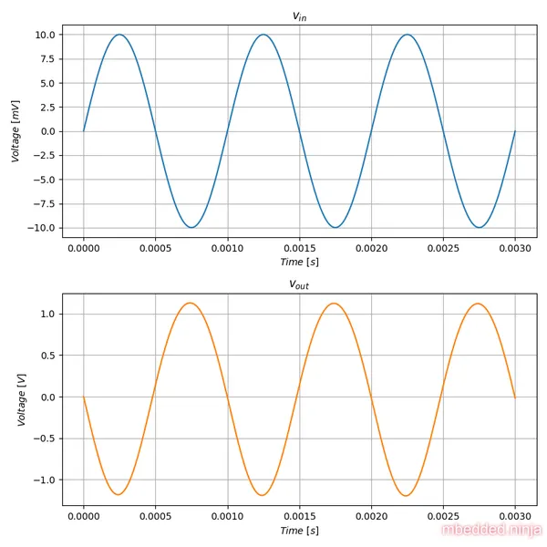 Given the large gain of , I didn’t want to saturate the output so I chose an input sine wave signal with an amplitude of at a frequency of . The simulated input and output voltages are shown in This is a placeholder for the reference: fig-common-emitter-amplifier-simulation-vin-vout-plot (note the change in the y-axis scale - the input is in and the output is in ).