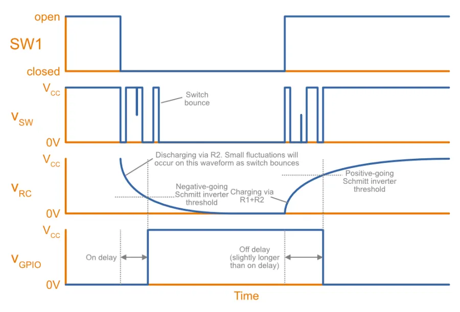 Hardware debouncing is about using passive components and simple logic to debounce switch presses. Before the advent of plentiful microcontrollers and lots of code space and capabilities, hardware debouncing was the common way of solving debouncing. These days I would recommend firmware based debouncing if possible, but sometimes you will have to revert to hardware debouncing when you don’t have the option of using a microcontroller.