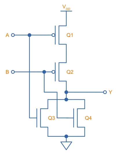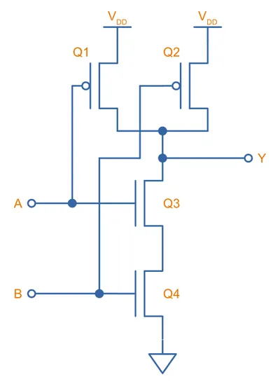 Two N-channels are connected in series on the bottom side, and two P-channels are connected in parallel on the top side. Both inputs ( and ) have to be HIGH to turn on both the lower side N-channel MOSFETs and drive the output () LOW. If either inputs are LOW, at least one of the high-side P-channel MOSFETs will be turned on, driving the output HIGH. This completes the NAND logic.