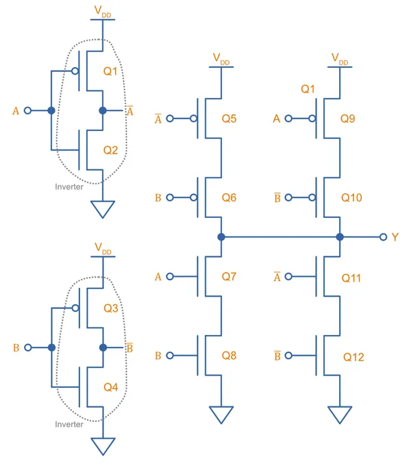 The CMOS XOR gate is the hardest CMOS gate primitive to build! It can be built with the circuit shown below, which uses a total of 12 MOSFETs, 3 times as many as the basic NAND and NOR gates!8