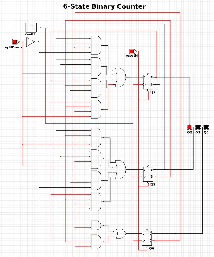The 6-state binary counter is a counter which counts from 000 to 101 in the normal binary fashion before resetting back to 0. The output increments on every rising-edge of the count pulse, and the direction pin (upNDown) determines the count direction (when upNDown = 1, the counter goes from 000 to 101, when upNDown is 0 the counter goes from 101 to 000).