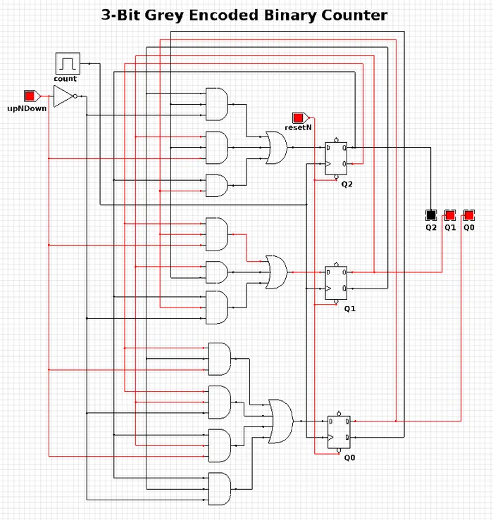 The 3-Bit Grey Encoded Counter is a counter that counts from 0 to 7 in binary in a grey encoded fashion. The counter increments on every rising edge of the bit ‘count’ and the direction bit ‘upNDown’ determines the direction of counting.