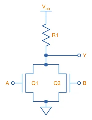 N-type Metal-oxide Semiconductor (NMOS) logic is a way of building logic functions from N-channel MOSFETs. In the early days of digital logic (1970s), it was much faster and easier to manufacture than CMOS, however since the 1980s CMOS took over and has become the dominant way of implementing logic gates6. NMOS is built from an arrangement of N-channel MOSFETs on the low-side (depending on the function) and a pull-up resistor on the high side.