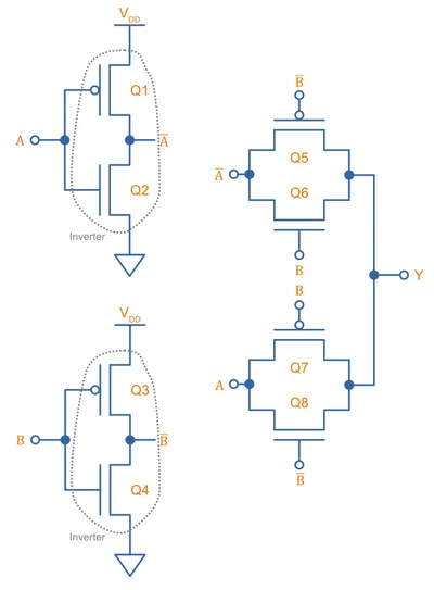 Above we showed how complex a XOR gate is to build in CMOS logic (12 transistors!). PTL logic can significantly reduce the transistor count for a XOR gate. One such implementaton is11: