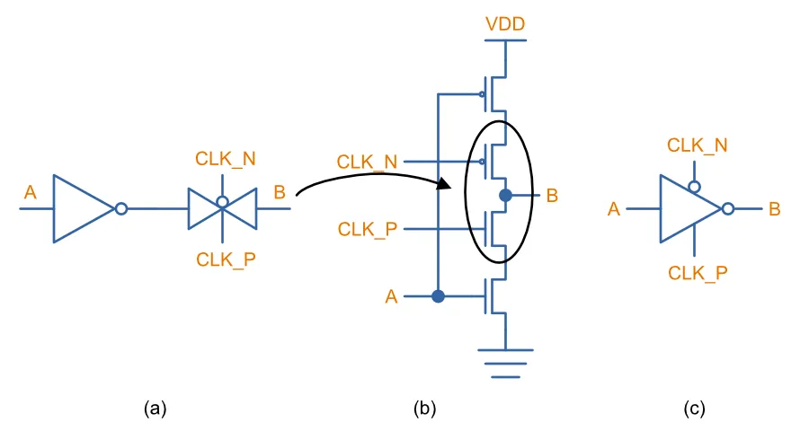 A useful building block for digital logic is a CMOS inverter whose output can also be tri-stated. The obvious way to do this would be connect the output of a regular inverter to a transmission gate, as shown in (a) in the figure below. But these MOSFETs can be recombined to make a single “totem-pole” stack which provides the same functionality, as shown in (b)9. In (b), the N-channel MOSFET of the transmission gate it connected in series with the N-channel MOSFET of the inverter on the lower leg. Likewise for the P-channel MOSFETs. This circuit is sometimes simplified to the symbol shown in (c).