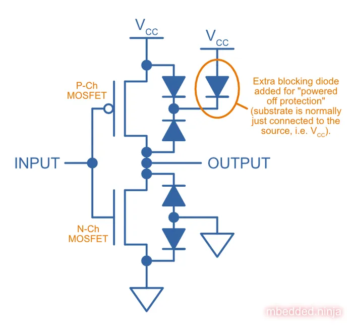 Some logic gates include “powered-off protection” to prevent this, and allow external signals to be present when the power rail is at . Texas Instruments calls this protection12. The figure below shows how the standard CMOS totem-pole driver is modified to provide “powered-off protection”.