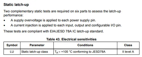 ICs are sometimes tested against the EIA/JESD 78A IC latch-up standard and the IC is provided with a latch-up class. The tests involve: