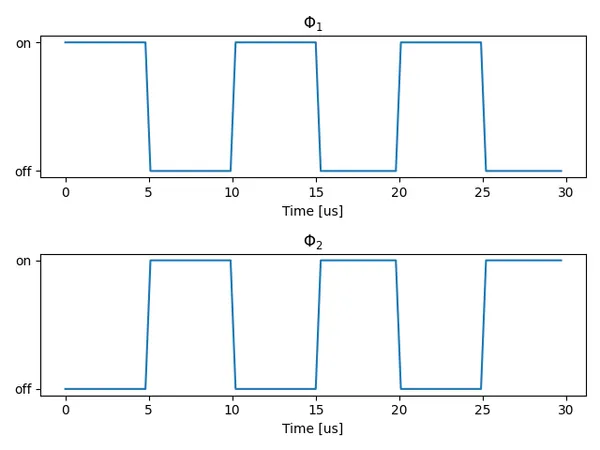The switches are switched on/off in an alternating fashion, where  controls SW1 and  controls SW2. This is shown in the below graph. A switching frequency of  is assumed.