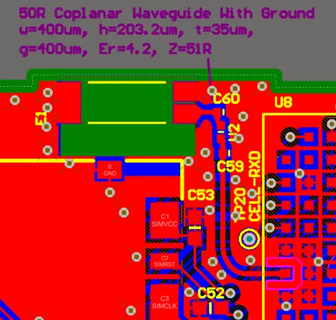 Although you can’t see it in the image above, there is a ground plane underneath the CPW (there are two internal layers between the visible top layer (red) and bottom layer (blue)).
