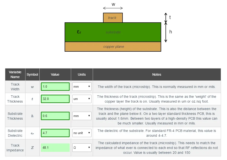 Go to https://ninjacalc.mbedded.ninja/calculators/electronics/pcb-design/microstrip-impedance to use an online calculator which uses these above equations (part of NinjaCalc).