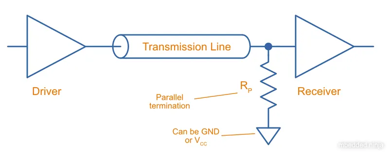 Parallel termination is a termination method in where a resistor is added to the receiver end of the transmission line, and is connected across the line and either GND or (hence in parallel).