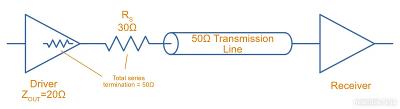 The below diagram shows a real-world example where the driver has an output impedance of , driving a transmission line. A series termination resistor is added to make the total series resistance equal to the transmission line’s characteristic impedance.