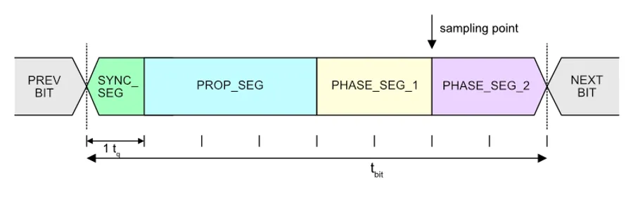 The below diagram shows the timing of a single CAN bit. A single CAN bit is broken down into different time segments. Each time segment is defined by an integer number of time quanta (). Time quanta is determined by the clock provided to the CAN transceiver. This CAN clock is usually provided from a faster system clock by dividing by a programmable pre-scalar. The minimum is 5, but there is usually 8 or more per CAN bit. The time quanta is the smallest amount of time that the CAN transceiver can adjust it’s timing by (i.e. it’s resolution).