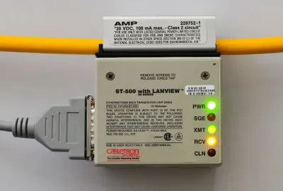 Matthew Millman (2012). Cabletron 10BASE5 Ethernet transceiver with AMP vampire tap. University of Helsinki. Retrieved 2026-04-09, from https://www.cs.helsinki.fi/u/kutvonen/index_files/ethernet.html. ↩