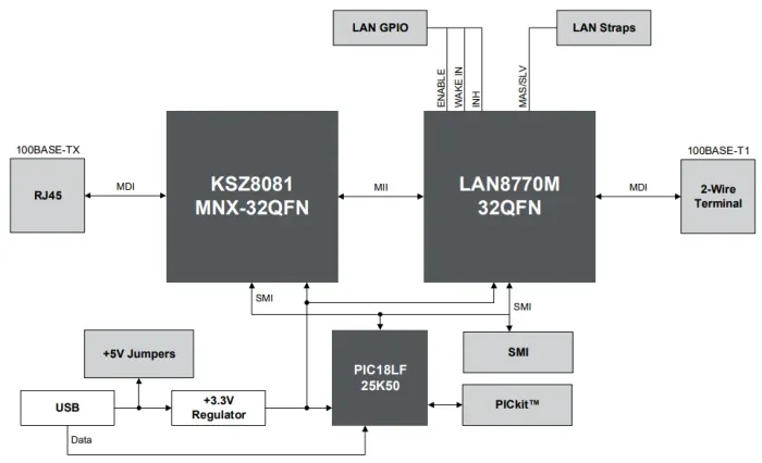 A block diagram showing the high-level architecture of the Microchip EV02N47A LAN8770M converter board is shown below. The two Ethernet transceivers are connected via MII.