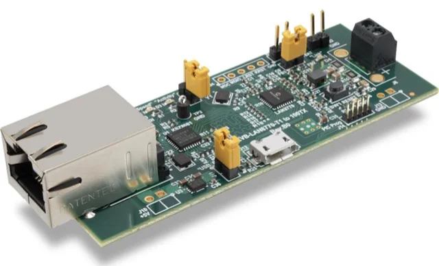 The Microchip EV02N47A is a conversion module which converts 100BASE-TX (standard ethernet) to 100BASE-T1 (single pair ethernet). It provides a conventional RJ45 jack for the 100BASE-TX side and a 2 port terminal block for the 100BASE-T1 side. The 100BASE-T1 is driven by an onboard LAN8770M transceiver.