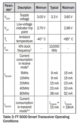 The FT5000 is designed to run of a 3.3V supply. In receive mode, it typically draws between 9mA (5MHz clock) and 38mA (80MHz clock). In transmit, it draws between 24mA (5MHz) and 53mA (80MHz). The peak currents are not much higher. Given these relatively low operating currents, it is easy to design a power supply for chip, possibly using something as simple as a linear regulator.