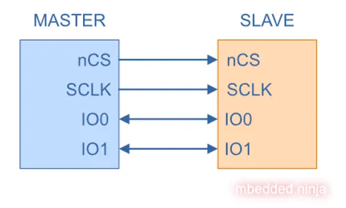 Dual and Quad SPI (QSPI) are extensions on the basic SPI bus which allow for faster communication rates. Dual SPI replaces the MOSI and MISO lines with bi-directional IO0 and IO1 lines. This allows twice the data transfer rate in any one direction at a time, however, it now makes the protocol half-duplex (it is now unable to transfer data in both directions at the same time).