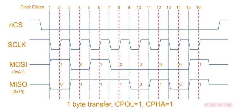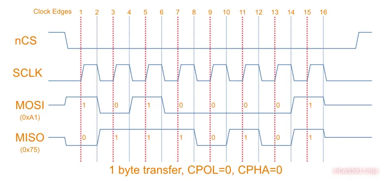 Below shows an example of a single-byte transfer with CPOL=0 and CPHA=0. The master sends the data 0xA1 and the slave sends 0x75. Data is sampled at the dotted red vertical lines.