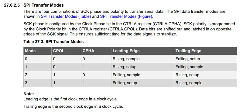 To give you an example of what it means for firmware, below is a screenshot of the SPI modes table from the Microchip SAM D21 MCU datasheet. We are lucky in this case, the SAMD21 microcontroller supports all four modes of operation.