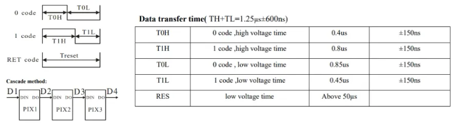 Depending on the MCU, generating these timings by “bit-banging” could be difficult because of the fast baud rate and HIGH/LOW timing requirements. However, an SPI peripheral running at a faster bit rate can be used to generate the data relatively easily. One option is to set the SPI speed so there are three SPI bits for every WS2812 bit. The SPI bit period can be set to 0.4us, so that three bits takes 1.2us. Then you can send the SPI bit pattern 100 for a WS2812 0 and a 110 for a WS2812 18. Using 8 SPI bits per WS2812 bit is another approach9.