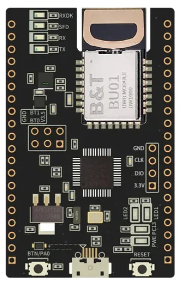 The AI-Thinker NodeMCU-BU01 UWB development board shown in This is a placeholder for the reference: fig-ai-thinker-node-mcu-bu01-uwb-dev-board-photo is a popular board for UWB development. It contains a BU01 UWB module and a STM32F103C8T6 microcontroller.5