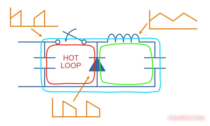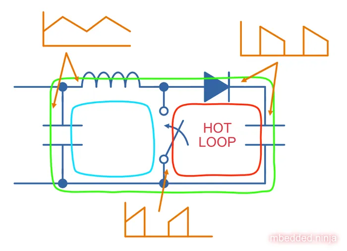 The loop involving the inductor and output capacitor are not so important because they experience a relatively smooth trapezoidal shaped current profile (at least when in continuous conduction). The input capacitor and switch however experience a much larger di/dt — when the switch is closed it goes from 0A and jumps up to the current through the inductor. It then follows the inductor current on the upwards rise until the switch is opened, at which point the current rapidly falls back to 0A. The diode is in a similar position, except it conducts when the input cap and switch are not (it takes the falling edge of the inductor current). Thus the “hot loop” creating the most EMI is the loop involving the input capacitor, switch and diode1.