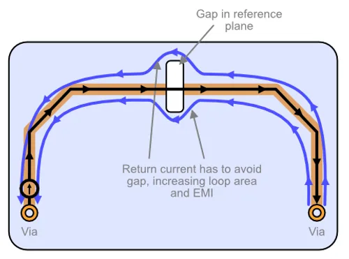 The below image shows what happens when there is a gap in the reference plane, preventing the return current from travelling directly underneath the trace. The current has to spread out around the gap, increasing the overall loop area and making the EMI worse.