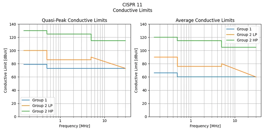 | Frequency of emission (MHz) | Group 1 Conducted limits (dBuV) | Group 2 LP Conducted limits (dBuV) | Group 2 HP Conducted limits (dBuV) | |||