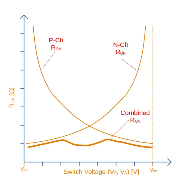 When the analogue switch is turned on, the resistance of each MOSFET depends on the analogue switch voltage. At low voltages, the N-channel MOSFETs resistance is very low and conducts most of the current. As the voltage rises, the P-channel MOSFETs resistance decreases whilst the N-channel increases, at the P-channel conducts most of the current. The graph below shows the resistance of each individual MOSFET, as well as the combined resistance seen by an external circuit. The combined resistance is the parallel resistance of both the N-channel and P-channel MOSFET.