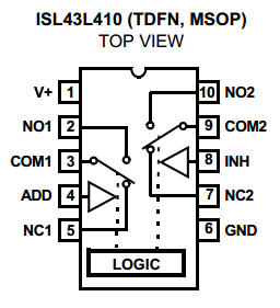 The Intersil ISL43L410 is a low on-resistance, low-voltage single-supply, DPDT analogue switch. One of its main selling points is it’s low power consumption with an  (typ) and  (max). Leakage current is  (typ),  (max).