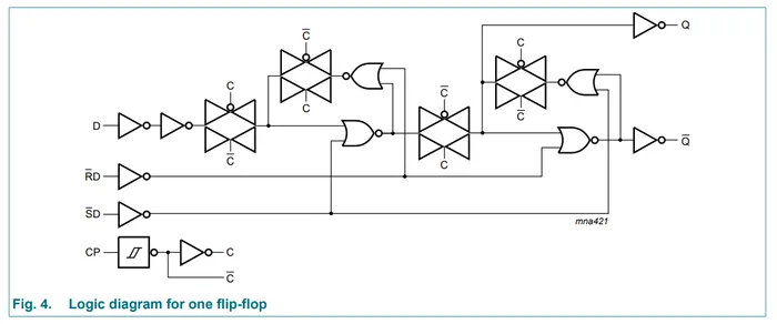 To show a real-world use case for a transmission gate, this is the logic diagram for the Nexperia 74HC74 dual D-type flip-flop IC3:
