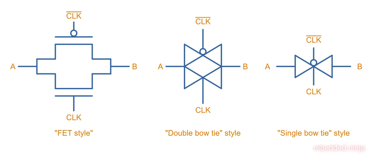 When showing a transmission gate on a schematic, it is almost never drawn showing discrete MOSFETs. It is usually simplified in the form of a “single bow tie” or “double bow tie” symbol, as shown below. Sometimes, simplified MOSFET symbols are shown, in where no arrows are used to indicate NMOS from PMOS, but rather a “inverting bubble” is added to the gate of the PMOS MOSFET.