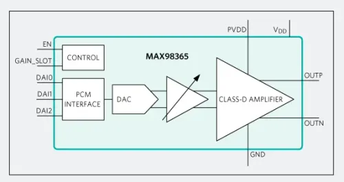 The Analog Devices MAX98365 is a family of mono digital PCM input class D audio amplifiers. It’s internal block diagram is shown in This is a placeholder for the reference: fig-max-98365-audio-amp-internal-block-diagram.