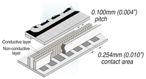 - Pitch of elastomeric connector is much smaller (at least twice as small, but ideally even finer), and no precise alignment is required. This method relies on there being at least one conductive part of the connector touching each pad on the component. This idea is very similar to anisotropic conductive film.