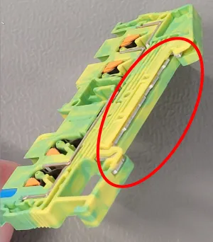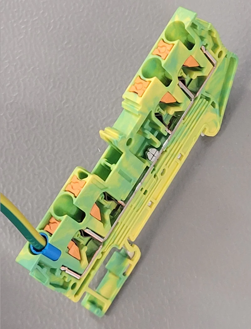 There are special earth terminal blocks available that also connect the terminals to the DIN rail. This is a placeholder for the reference: fig-earth-din-mounted-terminal-block-with-din-connection-highlighted shows how the connection to the DIN rail is made. This normally means don’t have to earth the DIN rail mounting plate with a separate lug which is saves time and space.