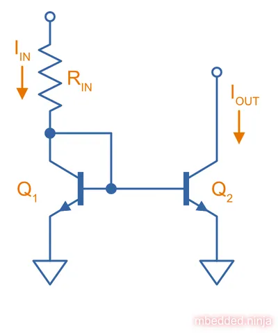 Both and should be identical transistors at the same temperature. The clever trick in this circuit is the base of which is connected to its collector. The BJT will adjust it’s base-emitter voltage to pass the input current. This is then applied to the base of . Because it is the same type of transistor as , this should cause the same base current, and the same will produce the same collector current through .