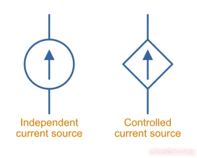 Current sources are very common in circuit design, and as such are usually drawn using schematic symbols as shown below. An independent current source is once which has a predetermined fixed set current. A controlled (or dependent) current source is one which is determined by another measurable value in the circuit, usually a voltage (e.g. ). You may have seen a controlled current source symbol in the small-signal model for a BJT. Many analogue IC functional diagrams will show current sources with these symbols, hiding the discrete components they are made from.
