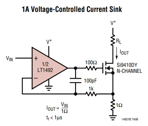 - The op-amp will keep turning the MOSFET on until the voltage drop across is equal to , meaning is the same as .