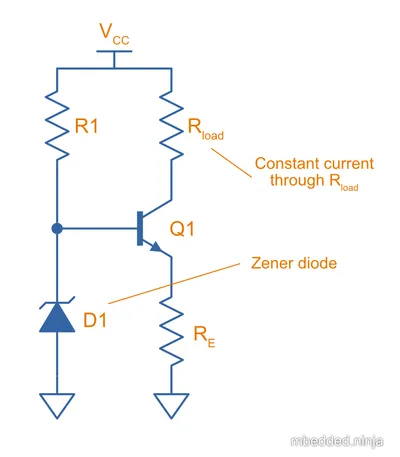 - The Zener diode , biased into it’s voltage regulation range with resistor , maintains a steady voltage at the base of the BJT transistor.