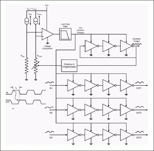 Most delay ICs work by using a chain of inverter gates, along with advanced circuitry to compensate for voltage and temperature variations and keep the delays accurate2. This is a placeholder for the reference: fig-ds1135-internal-circuitry shows the internal circuitry of the Analog Devices DS1135 “3-in-1 Delay Line” IC2.