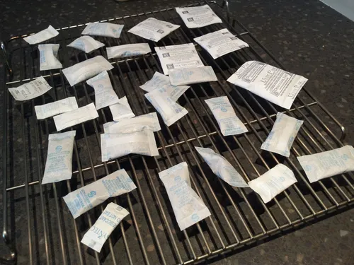 Be warned though, some packs of desiccant can’t handle the heat from re-drying! The packs which exploded/melted in the picture below where all the same brand, and the desiccant packet felt plastically rather than the other that felt more like paper.