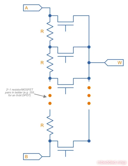 A DPOT usually is made from a string of closely matched, equal valued resistors. At each junction an analog switch (transmission gate) can control weather or not the junction is connected to the wiper. The analog switches are controlled over the digital communication bus, usually from a microcontroller writing to a register on the DPOT. A DPOT’s memory can either be volatile, where the set resistance information is lost on power down, or non-volatile where the DPOT retains the information for the next time it powers up.
