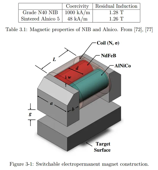 An electropermanent magnet (EPM) is a device which can have it’s magnetic field switched on/off by an electronic pulse. Once the pulse is applied, the magnetic field will retain it’s current state with the device unpowered.